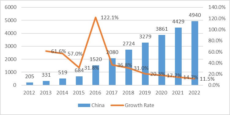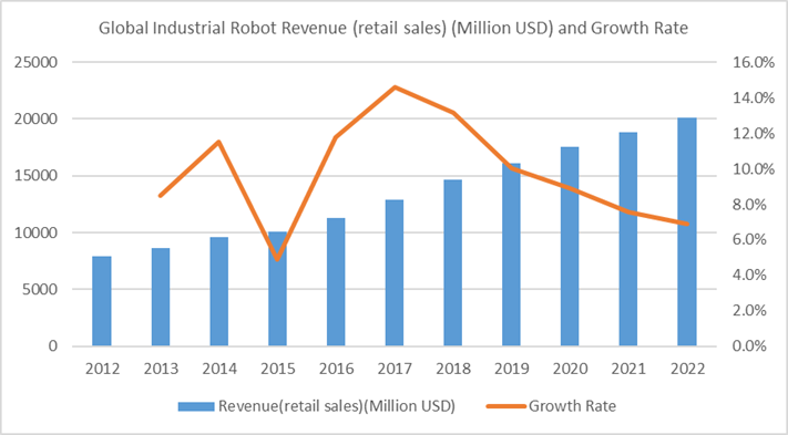 图:2012-2022年中国工业机器人收入(百万美元)和增长率