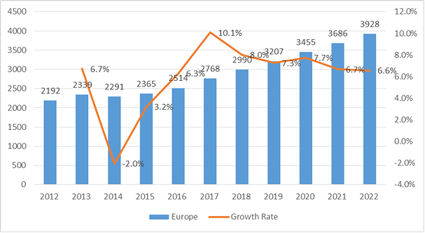 图:欧洲工业机器人收入(百万美元)和增长率(2012-2022)