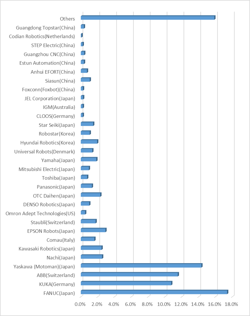 图:2016年全球工业机器人收入市场份额(%)(按制造商)