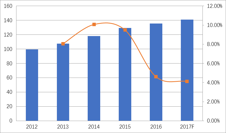 1.4.3.1欧洲中链甘油三酯收入(百万美元)和增长率(2012-2017年)