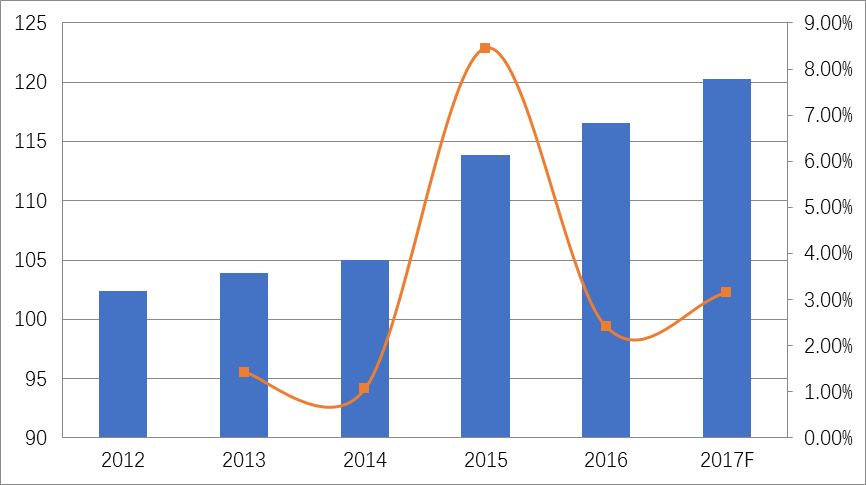 1.4.1.1北美中链甘油三酯收入(百万美元)和增长率(2012-2017年)