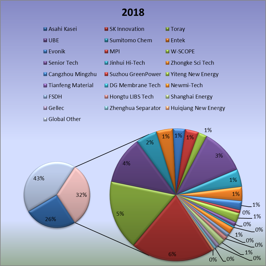 图:2018年按应用划分的电池隔膜全球生产市场份额