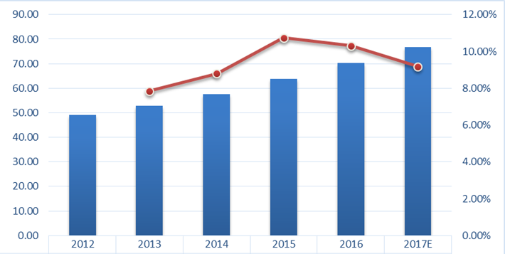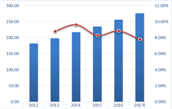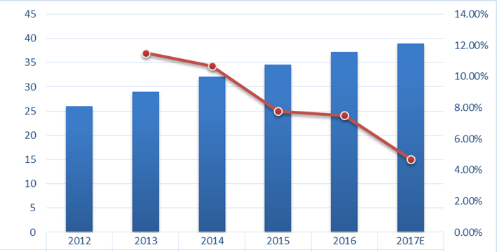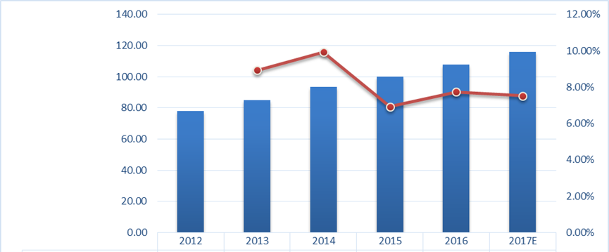 图:全球化学蚀刻市场收入(百万美元)和增长率(2012-2017)