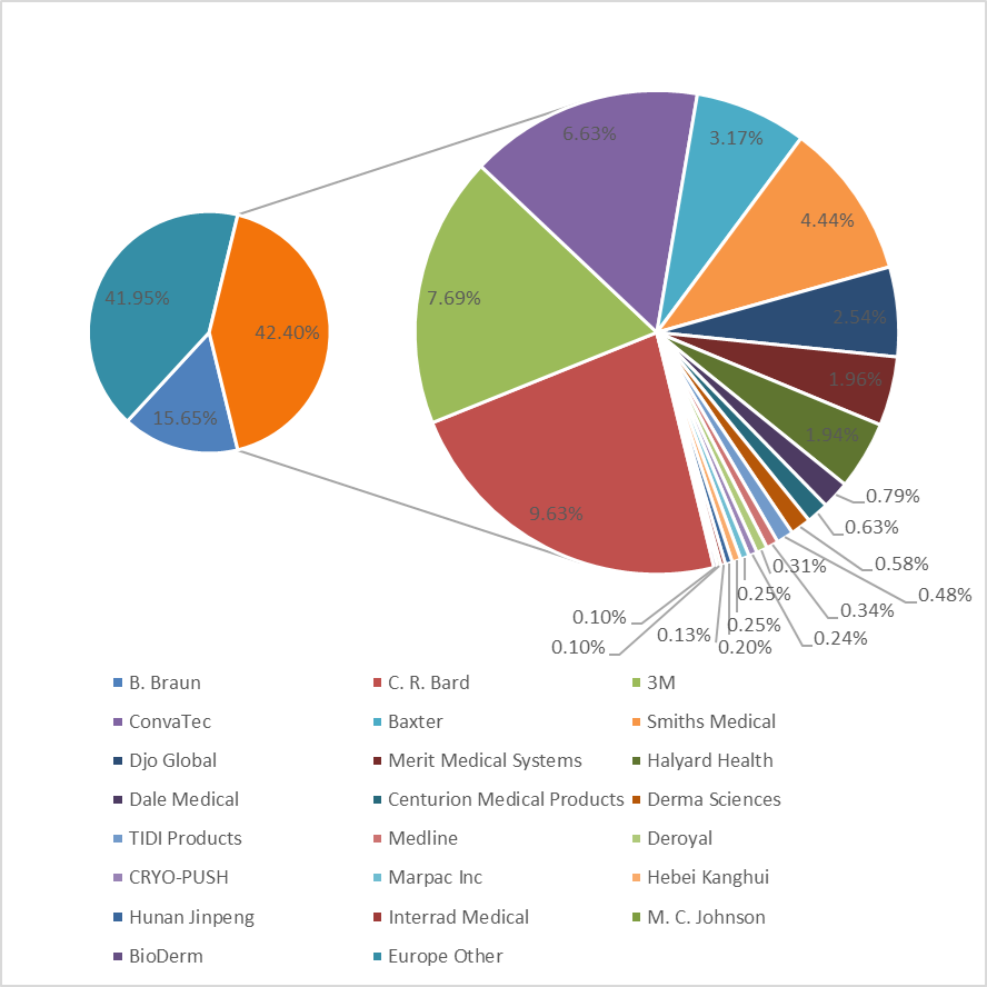 2.在欧洲市场,B.Braun是欧洲的领导者,其导管稳定装置的销售额为7166k台,约占欧洲消费量的13.86%。