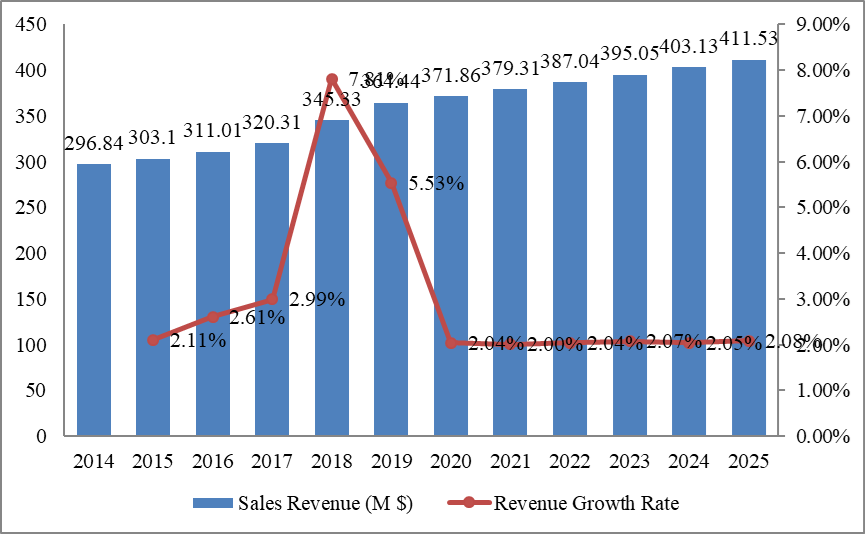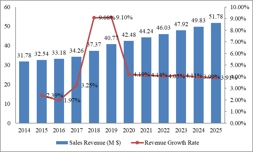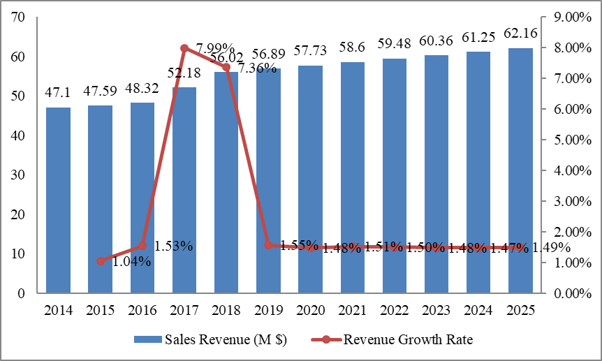 1.5.2欧洲市场导管稳定装置收入(百万美元)和增长率(2014-2025年)