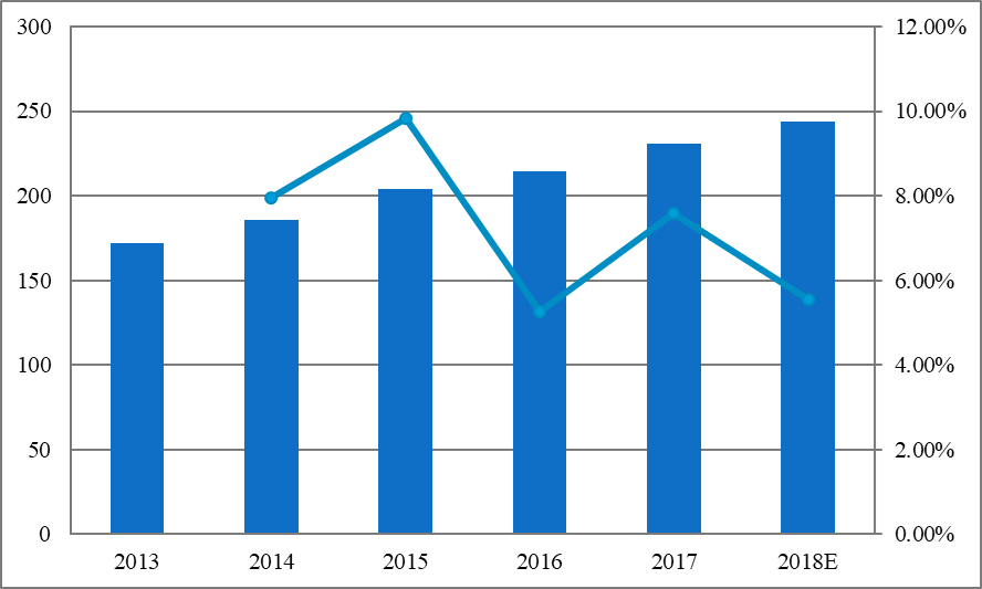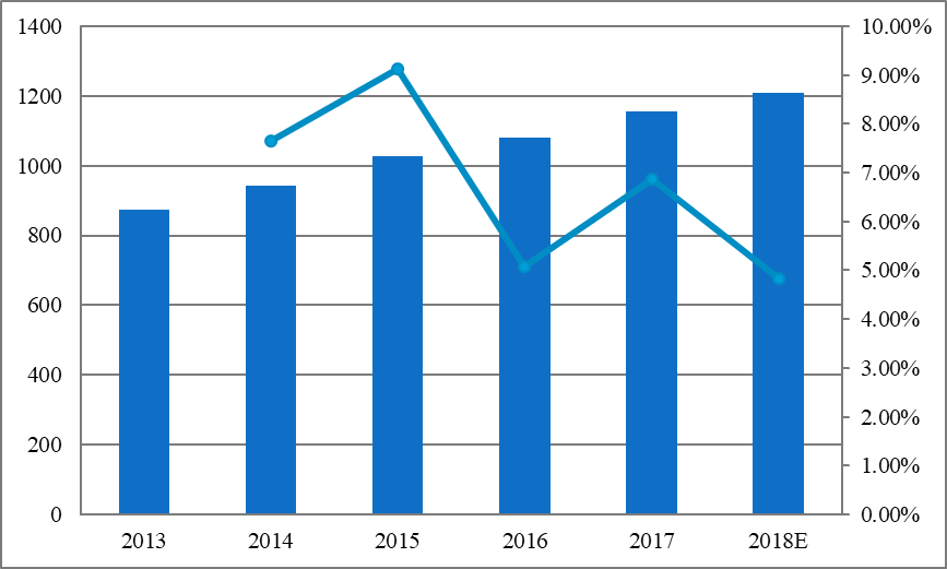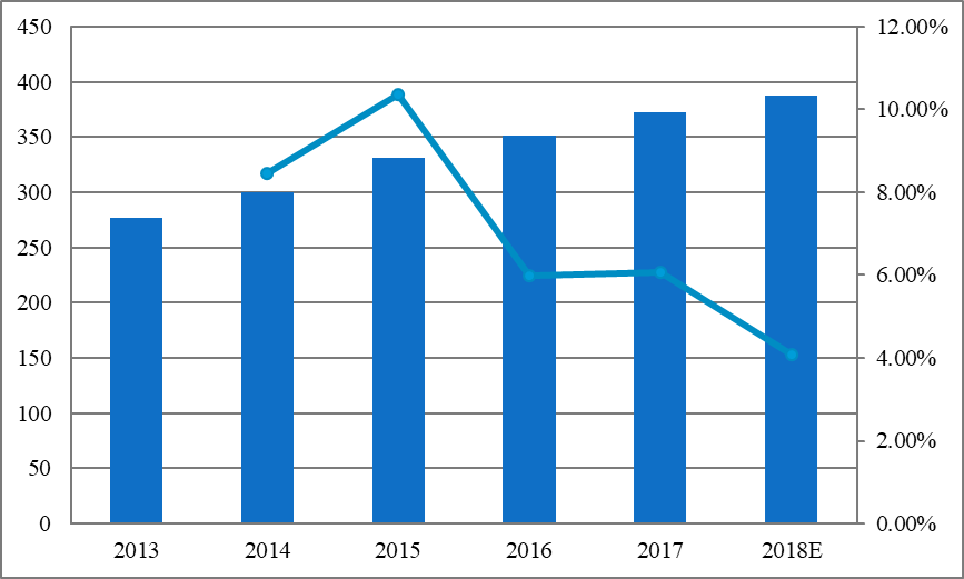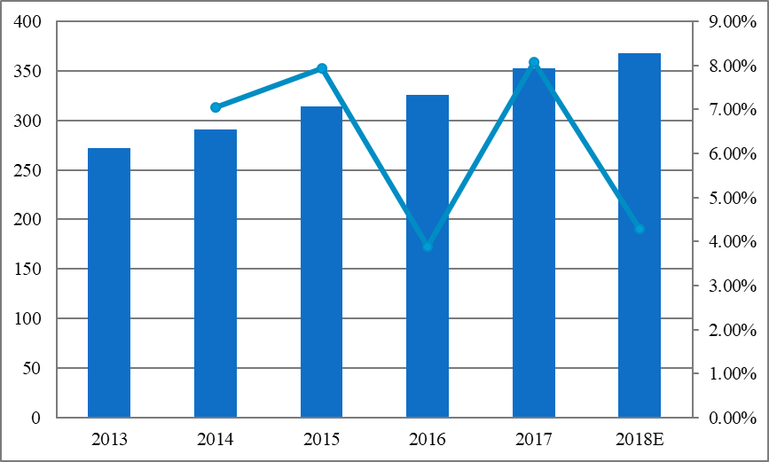 图:2013-2018年中国收入(百万美元)和增长率