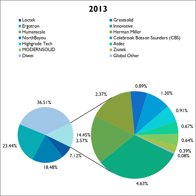 图:2013年全球液晶显示器支架市场收入份额(%)