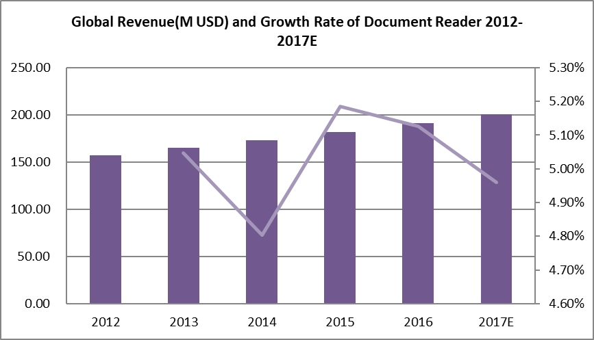 图:2012-2017年全球文档读取器收入(百万美元)和增长率
