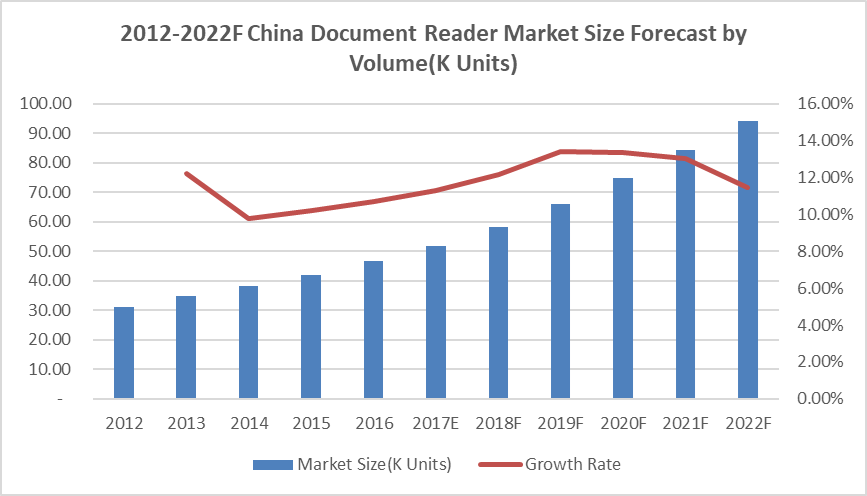 图:2012-2022F年中国文档阅读器市场规模(按容量(K台)和增长情况)