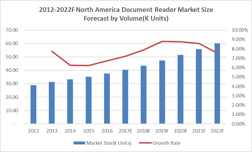 据市场调研发现,2016年,文档阅读器行业为19130万美元,预计到2022年将达到26376万美元,2016年至2022年的复合年增长率为5.50%。该市场由各种最终用户行业驱动,如航空公司和机场、安全和政府、酒店和旅行社、银行、火车和公共汽车总站等。