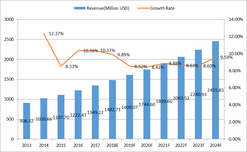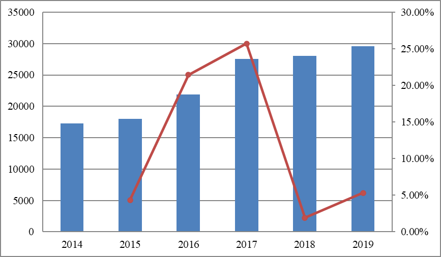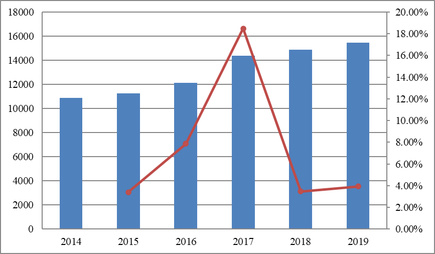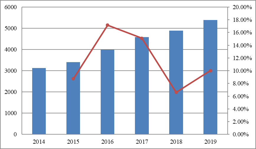 图:2014-2019年中国收入(百万美元)和增长率
