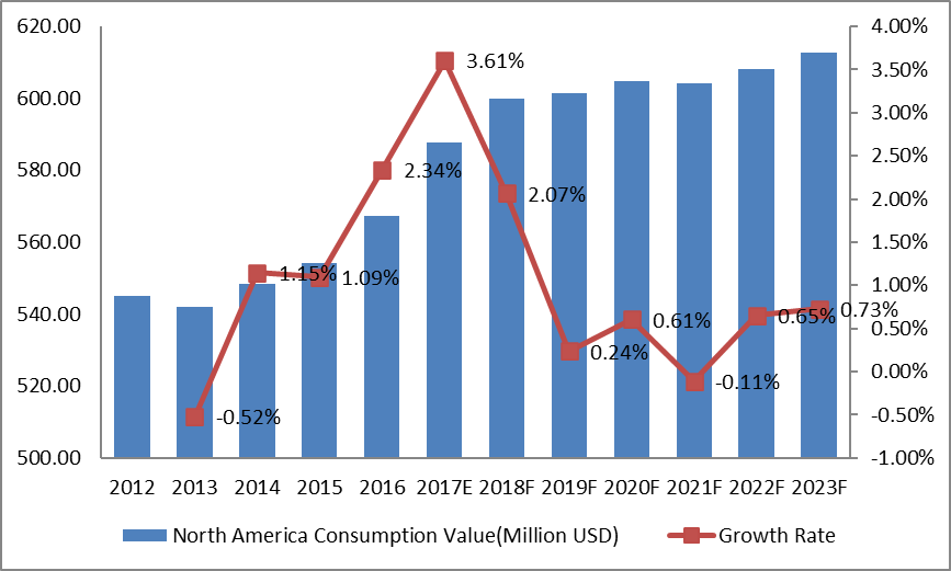 3、中东、非洲和北美是主要消费地区。2016年,北美收入5.67亿美元,占全球市场的27.8%。