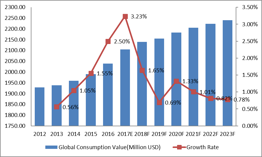 5.4按类型划分的全球除硫化氢产量增长率(%)(2012-2017年)