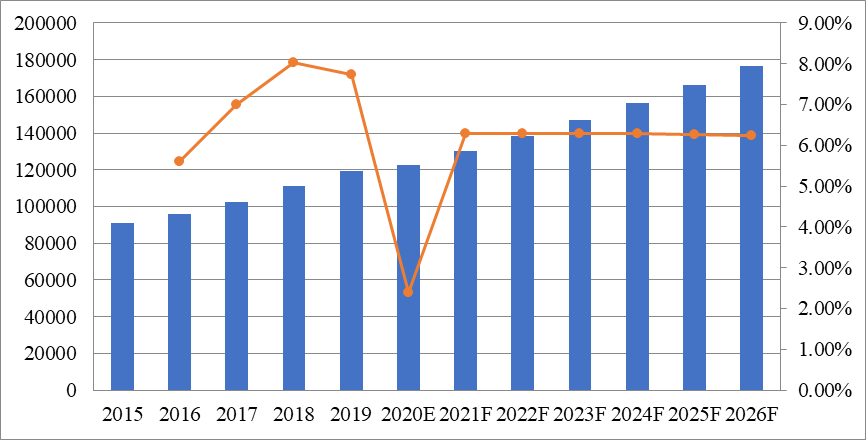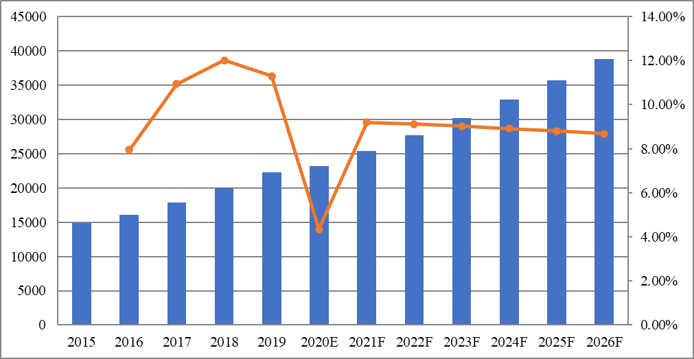 图:2015-2026年中国延长保修服务收入(百万美元)和增长率