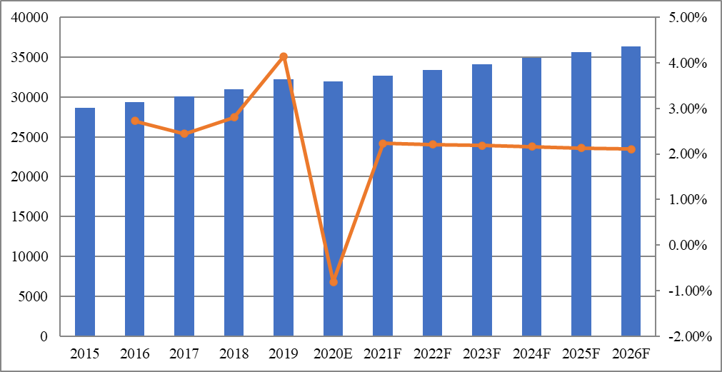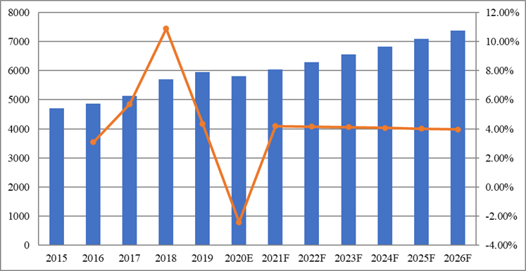 图:2015-2026年全球延长保修服务收入(百万美元)和增长率