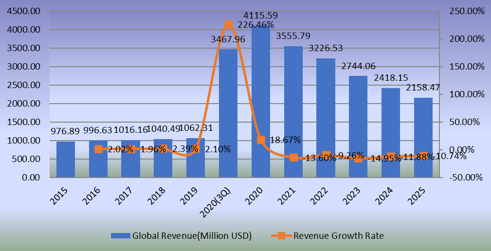 图:2014-2025年全球耐油涂层收入(百万美元)和增长率