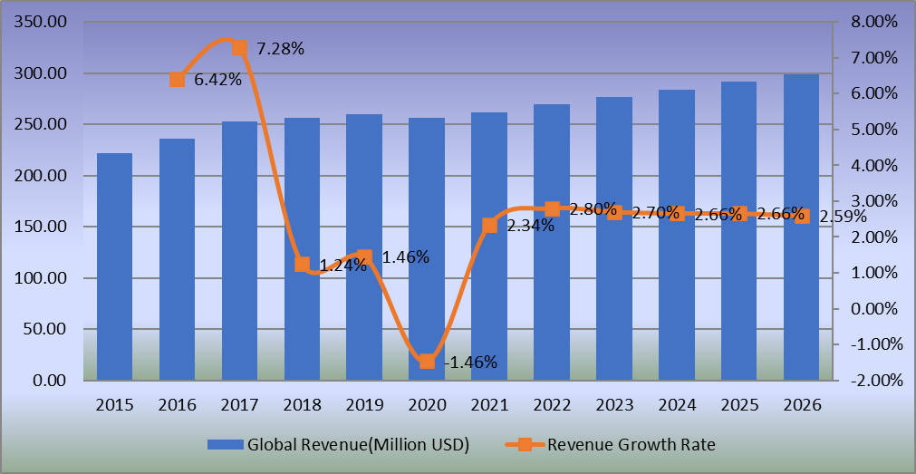 图:全球耐油涂料收入(百万美元)和增长率(2015-2026年)